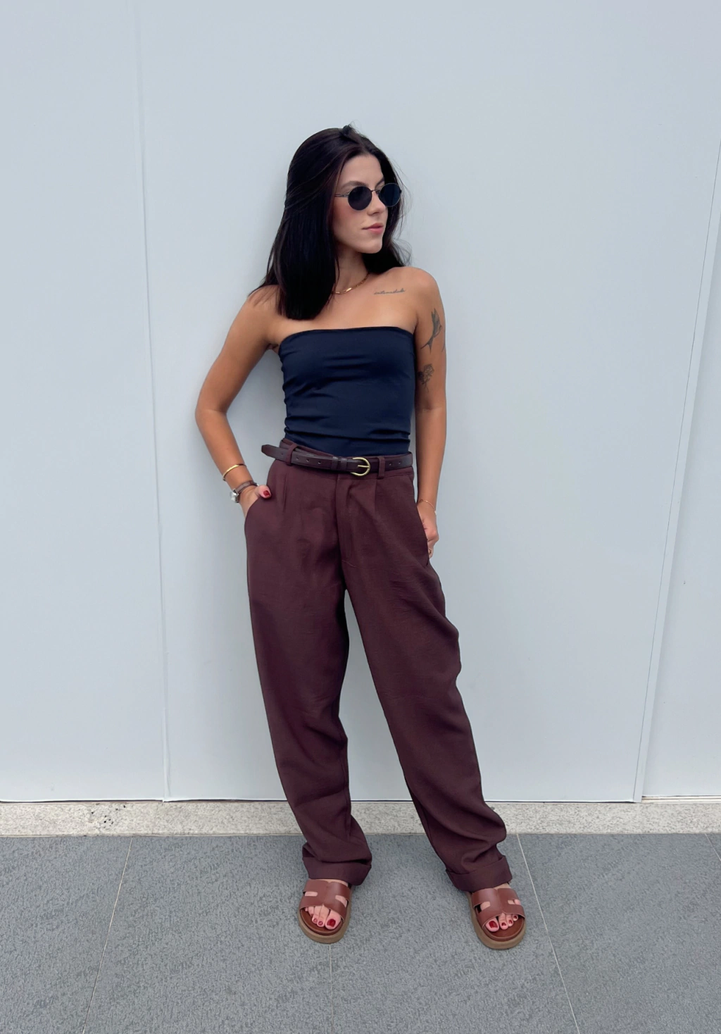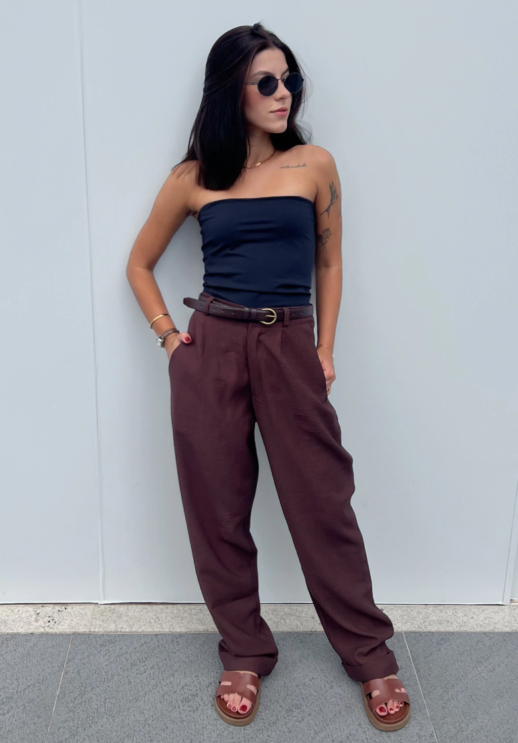 A Calça Ravena é uma peça de cintura alta, feita em viscose mais estruturada, ou seja, o toque super macio da viscose com o caimento de alfaiataria. Em seus detalhes, o fecho é de alfaiataria e as costas contam com um elástico na cintura para a calça se modelar no seu corpo, ah e tem passantes para colocar um cinto e completar o look.