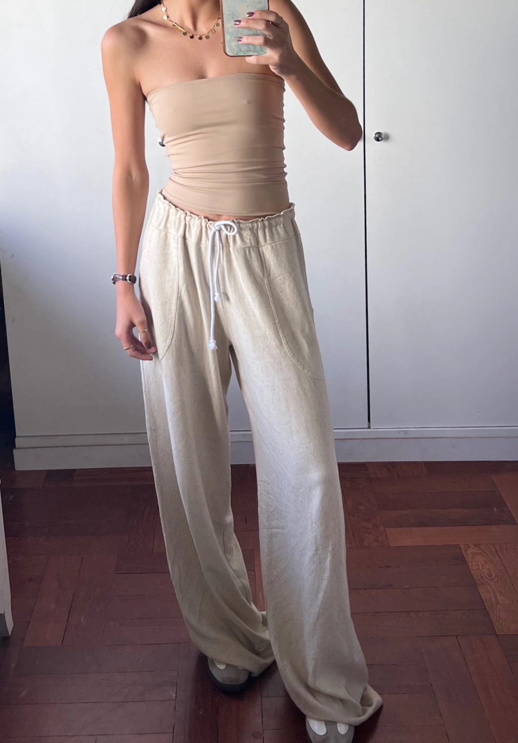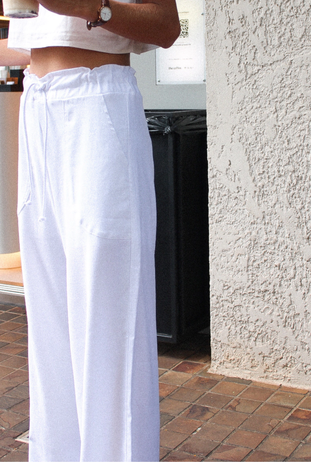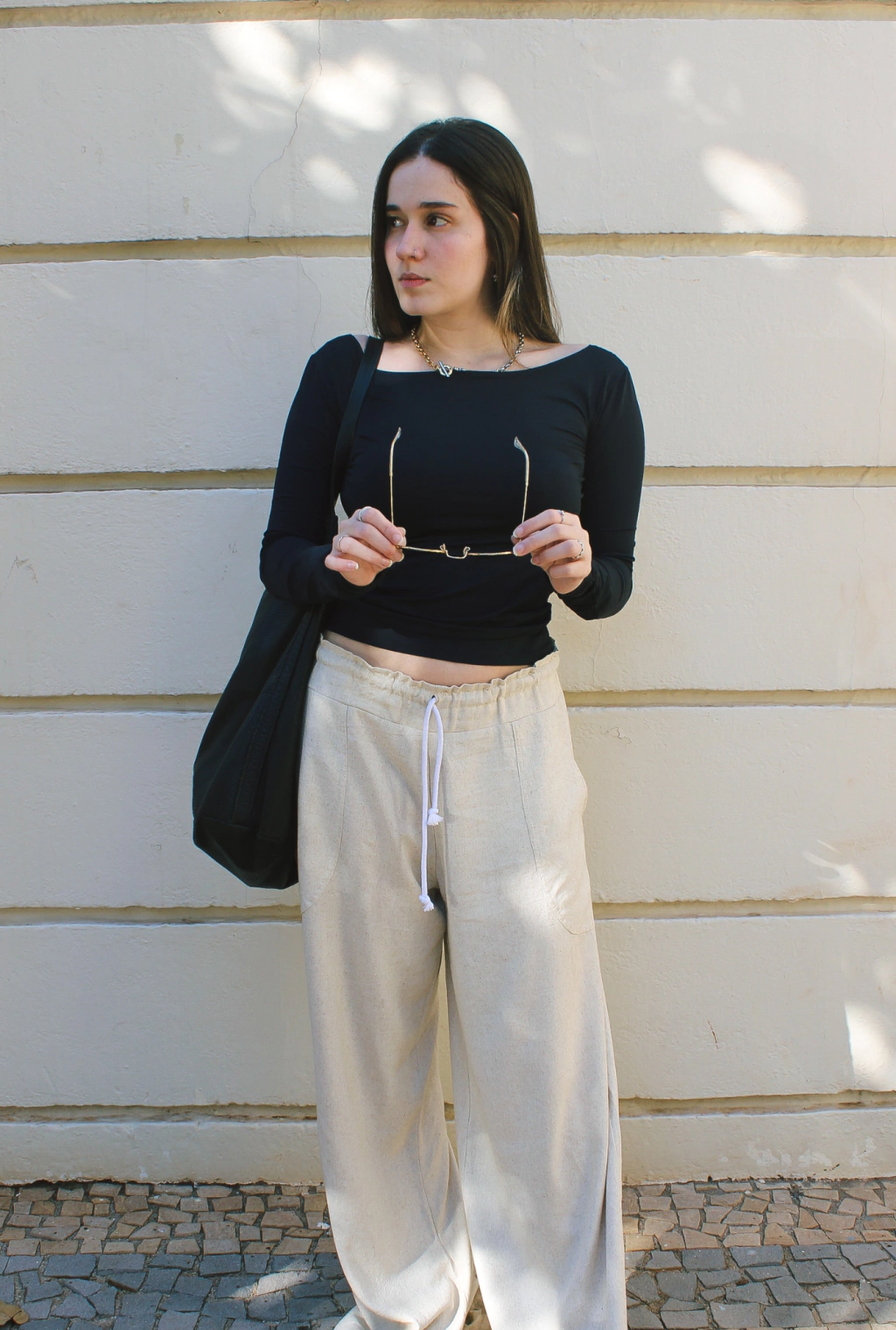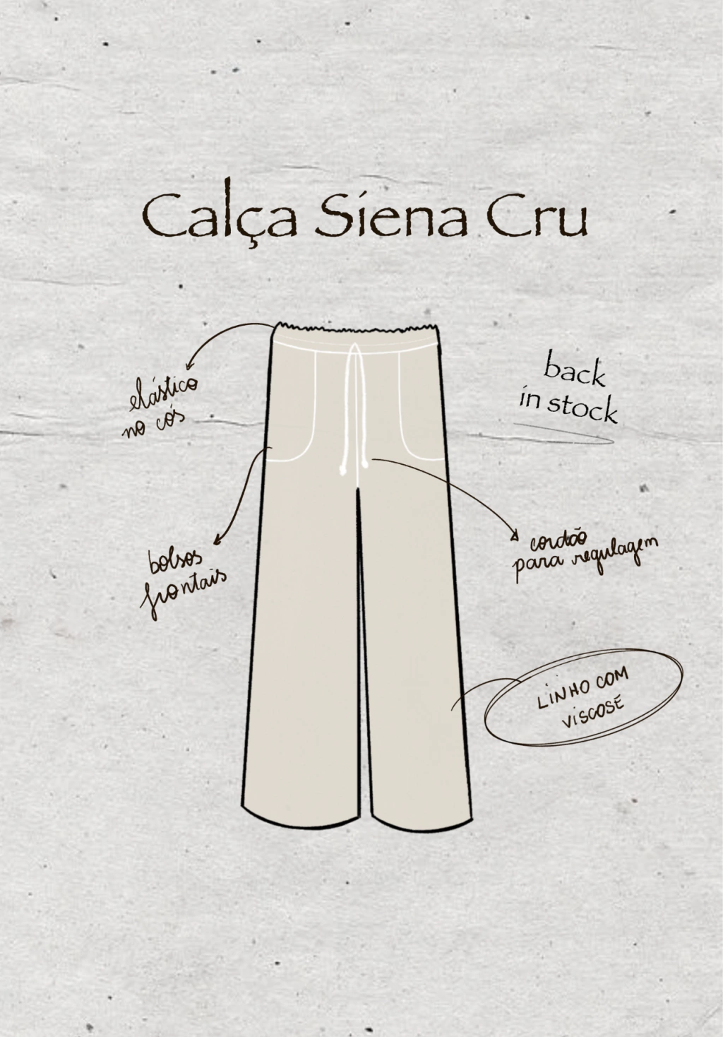 A calça mais estilosa e confortável de todas. A Calça Siena é de cintura alta mas pode facilmente ser usada na cintura baixa (o que eu amo). Possui bolsos laterais, cadarço e elástico na cintura, podendo deixar a cintura bem marcada ou mais soltinha, e proporcionando muito conforto. O tecido tem um caimento leve e fresco dando ao look um visual despojado, mas ao mesmo tempo arumadinho.