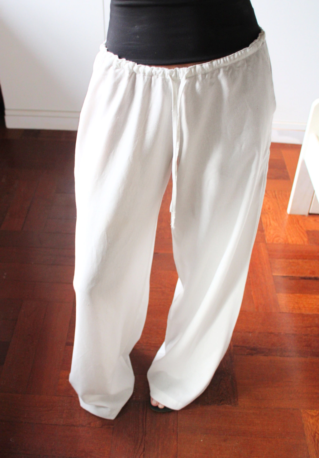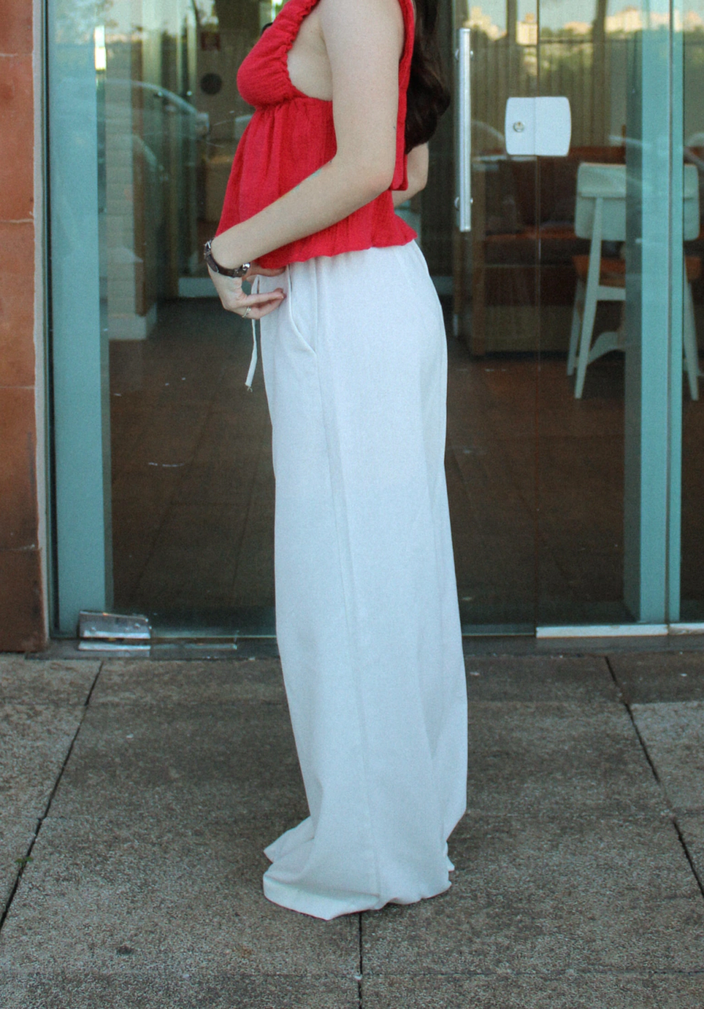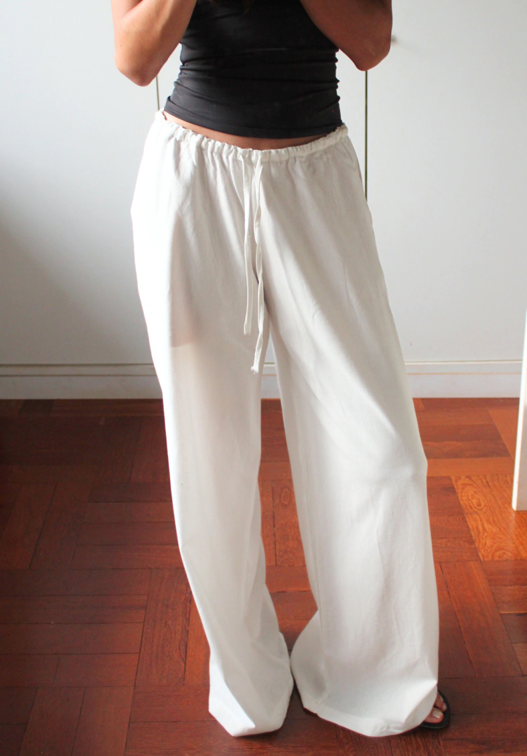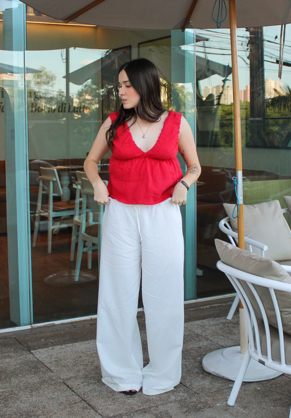 A calça mais estilosa e confortável de todas. A Calça Toscana é de cintura alta mas pode facilmente ser usada na cintura baixa (o que eu amo). Possui bolsos laterais internos, cadarço e elástico na cintura, podendo deixar a cintura bem marcada ou mais soltinha, proporcionando muito conforto. O tecido tem um caimento leve e fresco dando ao look um visual despojado.