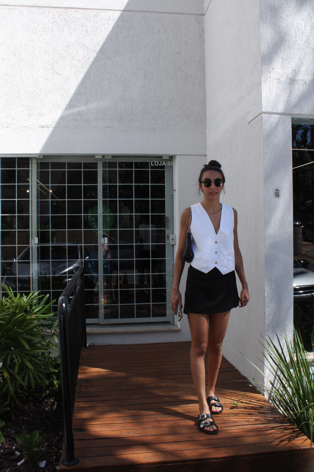 A modelagem dele é bem soltinha. Então ele é um colete mais over, bem confortável e ao mesmo tempo ele é estruturadinho com a cara da alfaiataria! O acabamento dele é todo com costura embutida, trazendo mais elegância e qualidade como um colete lindão desse pede!