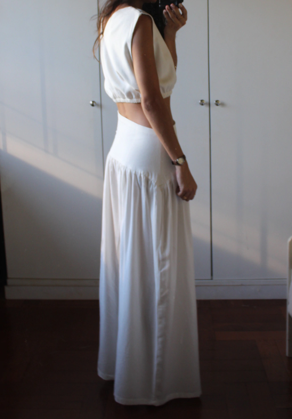 M: Altura 108cm; altura cós 16,5cm; Circunferencia Cintura diagonal 86cm; zíper 25,5cm; veste 38/40
